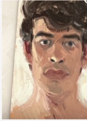 Óleo sobre cartón que presenta un autorretrato del artista con una paleta expresiva y pinceladas sueltas.
