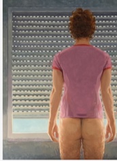 Óleo sobre lienzo con una composición humorística que juega con referencias clásicas y contemporáneas.