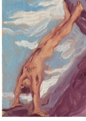 Óleo sobre cartón que forma parte de una serie explorando el mito de Sísifo con tonalidades azules y moradas.
